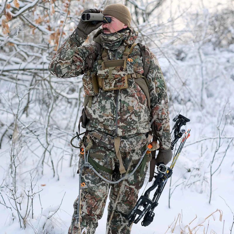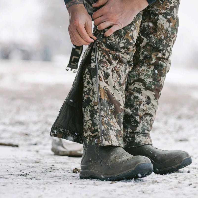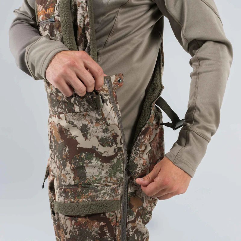 The Thermic Bib is purpose-built for bitterly cold days in the treestand or blind and is the coldest weather component of the First Lite whitetail outerwear kit. Built using 170gsm PrimaLoft® Gold insulation in the body and legs and 60gsm insulation in the kangaroo pocket, sherpa fleece lining, and windproof technology to keep you more comfortable and maximize warmth. Additionally, it's ultra-quiet, durable, water-resistant, and includes our improved windproof technology. The Thermic Bib is packed with whitetail features, including treestand-specific pocketing, full-leg zips, adjustable waistband, and KitLink™ system compatibility. This bomber cold-weather bib insulates exceptionally well, blocks the wind, allows ease of movement, and wears like iron.